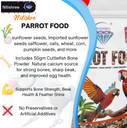 | Ingredients | - Mix bird food for Parrot Food with best quality ingredients and balanced nutritious diet., Includes high-quality sunflower seeds, importedsunflower seeds, oats, wheat, corn, pumpkin seeds, and more – triple-cleaned, dust-free, and preservative-free for safe daily feeding., FREE Calcium Powder (50g)