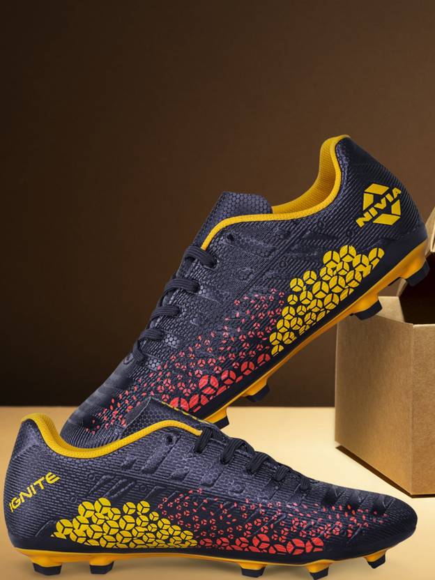 Unleash superior grip and water resistance with NIVIA Ignite football studs. The PU synthetic leather upper and 3D embossed texture provide excellent support, stability, and a locked-in fit for precise ball control. Enjoy lightweight comfort and a personalized, irritation-free fit with high-density foam lining and a die-cut EVA sockliner. The triangle studs offer explosive force and quick direction changes, while the durable TPU sole ensures flexibility and abrasion resistance, enhancing your performance on the pitch.