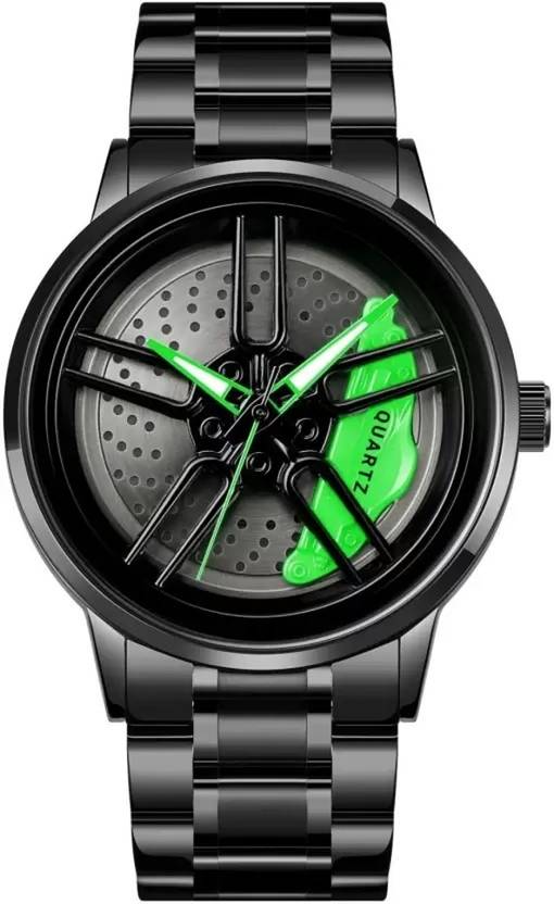 Tencel 3D Rotating Spinning Watch Quartz Men Rim Car Green Wheel Watches