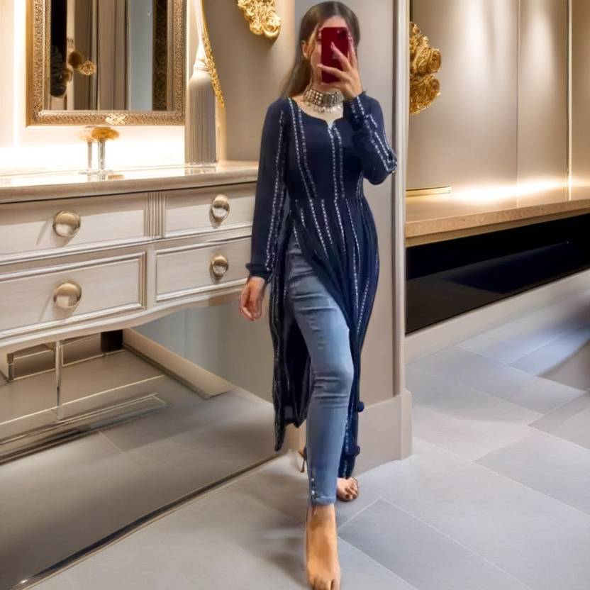 ? Let your elegance reflect with this gorgeous red, black, firoji, navy blue colors kurti made with georgette material and created with pleasant sequin embroidered work. ? This casual wear red georgette kurti is for daily wear use with ankle-length denim or jegging pants at the college, or for an outing anywhere. ? This georgette event wear kurti is ready to wear. ? When it comes to searching for trendy kurtis online, this georgette kurti with pants is the most satisfactory choice for you.