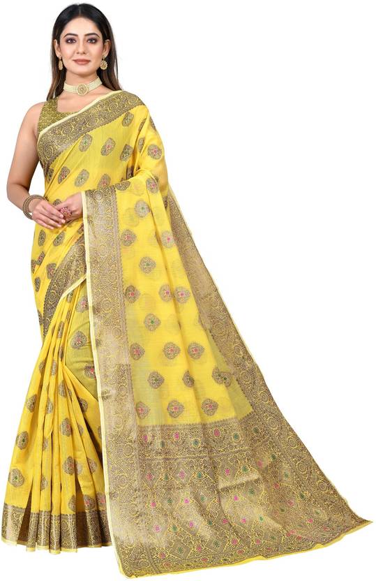 Saree Fabric : Banrasi Cotton silk jacquard saree || Saree Color :Yellow|| Saree Length : 6.3 Mtrs Including Blouse (5.5 mts+.80 cm Blouse ) Blouse Fabric : Pure silk || Blouse Color : Yellow || Blouse Type & Length : Unstitched Blouse Piece With .80 cm || Work Type : Floral Butti with heavy gold zari border kanjivaram type || Soft Finished || Comfortable to wear || Wash Care : Dry Clean Wash || Hand Wash Occasion: Sarees For Daily Wear || Regular Wear Sarees || Party Wear Silk Sarees || Cotton silk Sarees For Women Latest Design || Pure silk Cotton Sarees " NIYAMI '' Brings to you this saree which is made from Pure Banarasi Silk material and its available in an example color. The saree is a suitable amalgamation of style with the grace that is required from an ethnic wear. You can wear it to casual occasions as well as make it a part of your festive wear.