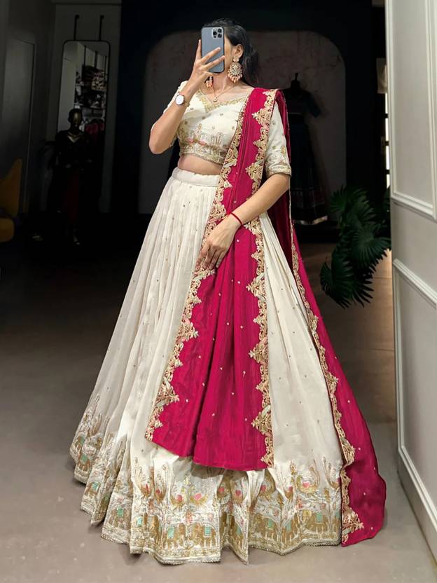 Dazzle in this elegant Chinon Lehenga Choli for Women featuring a free-size fit, 43-inch length, and 3-meter flair for a graceful silhouette. The Lehenga, Choli, and Dupatta are crafted in soft Chinon fabric with heavy sequins embroidery, making it perfect for weddings, festive celebrations, and chic gatherings. A timeless choice for anyone seeking a Wedding Lehenga Choli, Festive Lehenga Choli, or Embroidered Lehenga Choli with Dupatta.