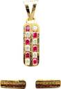 Make a dazzling statement with the Luxe Spark Gold Pendant & Earrings Set. This elegant set features a sleek rectangular design adorned with dual rows of radiant ruby-red and sparkling white stones. The polished gold finish adds a luxurious touch, while the geometric detailing exudes contemporary sophistication. Perfect for enhancing your formal attire or adding glamour to your everyday ensemble, this set is a must-have for jewelry enthusiasts seeking timeless elegance.
