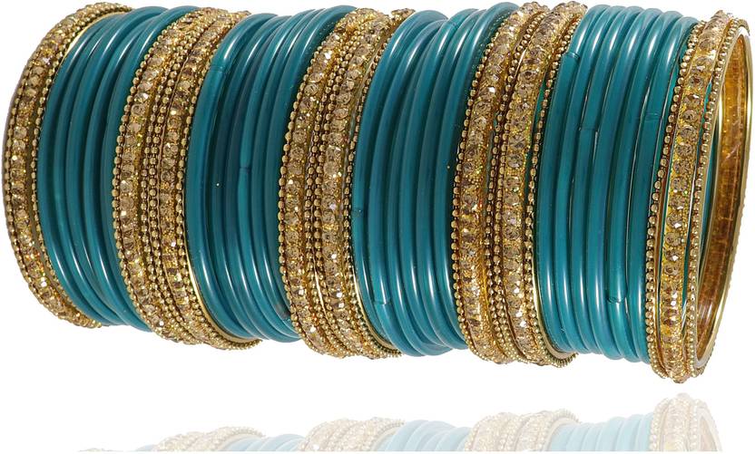 Women love jewellery; specially Bangles adore a women. They wear it on different occasion. They have special importance on ring ceremony, wedding and festive time. They can also wear it on regular basics. Make your moment memorable with this range. This Bangle set features a unique one of a kind designer with Glossy finish