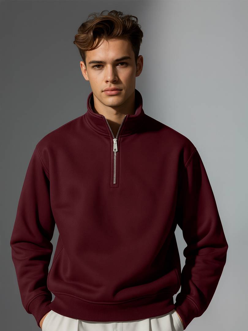 Nobero Relaxed Fit Mock Neck Sweatshirt for Men Stay effortlessly stylish and cozy with Nobero's Relaxed Fit Mock Neck Sweatshirt . Designed for men who value comfort and minimalism, this sweatshirt features a solid pattern with a mock neck that adds a casual yet trendy touch. Crafted from a premium blend of 85% cotton and 15% polyester, the 280 gsm fleece fabric ensures warmth and durability, making it perfect for cooler days. The full sleeves and relaxed fit provide a relaxed and laid-back vibe. This sweatshirt brings a modern, relaxed-fit silhouette to your wardrobe, perfect for any casual occasion.