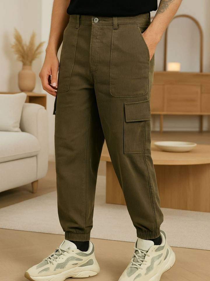 Upgrade your wardrobe with the Nobero Oversized Corduroy Pants, designed for ultimate comfort and style. Made from 100% premium cotton fabric with a 240 GSM weight, these pants offer the perfect blend of durability and breathability. The oversized fit provides ample room for movement, while the stylish cargo design features two utility pockets, deep elevated regular pockets, and two welt pockets on the back for added functionality. A belt-loop waistband with a button and zip-fly closure ensures a secure and adjustable fit. Pair these versatile pants with a casual tee, pullover, or hoodie for a trendy, laid-back look. Ideal for casual outings, weekend getaways, or everyday wear, these corduroy pants are a must-have for any modern man's wardrobe.