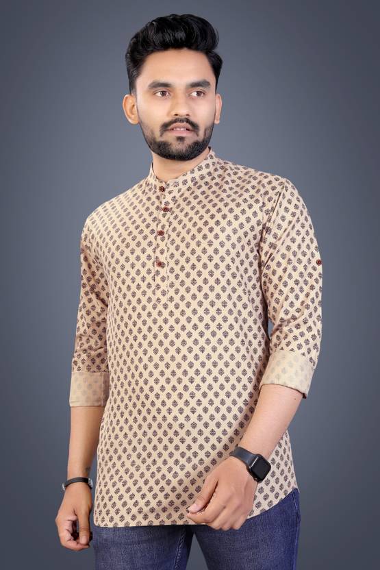 Men Printed Cotton Blend Straight Kurta (Beige)