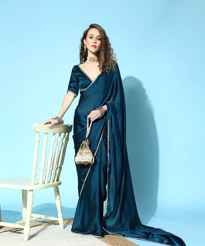 shining rangoli satin silk solid with beautiful sequned embellished lace border saree