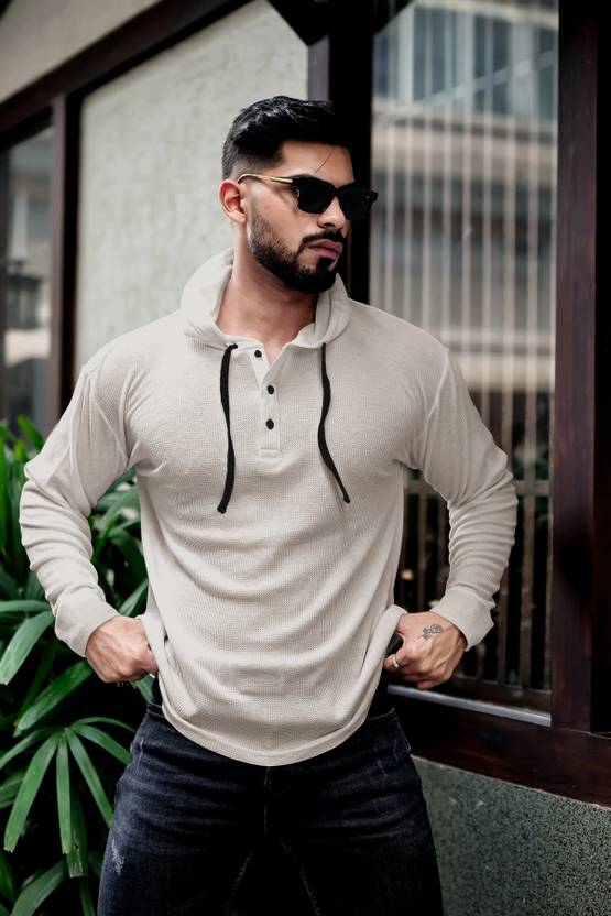 NOOK Solid Men Hooded Neck Beige T-Shirt