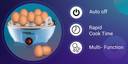 Consuming only 350 W of power, this egg boiler can efficiently and rapidly boil and cook eggs.