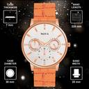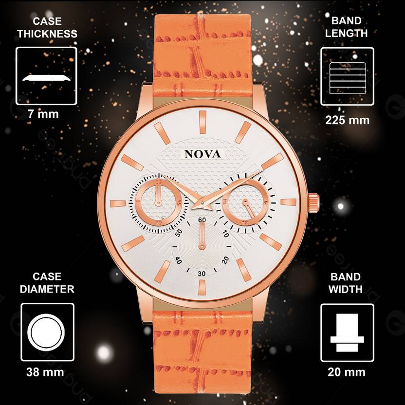 Elevate your style with the elegant NOVA Rose Gold Analog Watch featuring a sleek 38mm case and a premium leather-textured strap in a warm tan shade. The beautifully designed white dial with rose gold accents and sub-dials adds a sophisticated flair to your look. Perfect for both casual outings and formal occasions, this timepiece offers a perfect blend of style and utility.