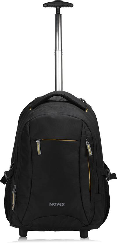This black Novex Pacific trolley laptop backpack is made up of high quality water resistant polyester fabric with multi-compartment design and a fully-padded laptop space that fit laptops upto 15.6 inches. This has a deluxe media pocket , smooth rolling corner-mounted wheels, a hideaway telescoping handle, air mesh padded shoulder straps and a primary padded back panel which makes it a best pick for all purposes. It has a side pocket for keeping all daily essentials nd water bottle. This laptop bag have a high quality push button trolley system which adds on an additional value to the bag.