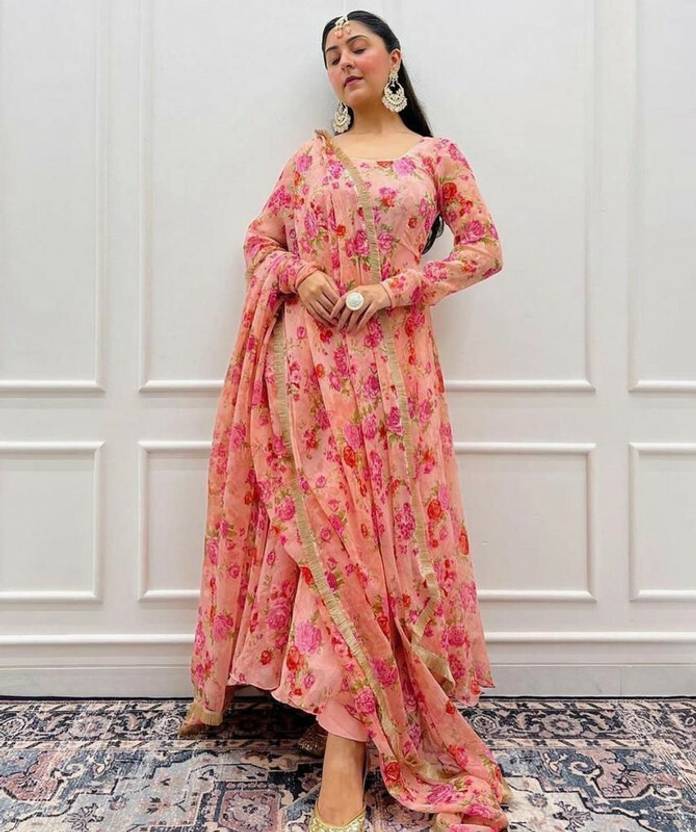Printed Georgette Stitched Anarkali Gown (Pink)