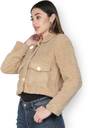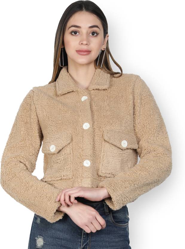 Super warm and stylish sherpa beige jacket is perfect outerwear for chilly fall days you will love to have. Super soft finish fabric keeps you snug all day long. Features contrast button closure with 2 pockets, long sleeves, an attached lining. Team this piece with denims and a casual tee and shoes.