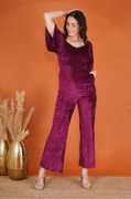 " This jumpsuit is a stylish, elegant piece made of soft velvet fabric with a vertical pleated texture. It is in a beautiful Maroon shade which giving it a luxurious and sophisticated look. The design features a sweatheart neckline that enhances the collarbone area, along with short, flayerd sleeves that provide a relaxed and feminine touch. The pant legs are slightly wide for a comfortable yet chic appearance. This jumpsuit is perfect for both casual and semi-formal occasions, offering a blend of comfort and fashion.