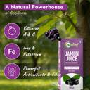 Owing to its rich nutritional profile, this jamun juice offers a range of essential nutrients in every 100 ml serving. Moreover, this juice is carefully extracted from organic jamun collected from company-owned farmlands, ensuring an unadulterated, and undiluted product. Furthermore, with each sip, you receive up to 33.32 kcal of energy, 7.78 g of carbohydrates, and 0.55 g of protein, making it a nutritious and low-calorie choice for your daily diet. Also, the goodness doesn't end there; this juice is packed with essential minerals, providing you with up to 4.80 mg of calcium, 85.00 mg of potassium, and 31.00 mg of sodium, offering a healthy boost of vital nutrients to support your overall well-being. In addition, this juice is free from any artificial colour or flavour, ensuring you experience the authentic taste of natural jamun with every sip. As a result, it helps purify your blood, promotes healthy skin, good for the eyes, control cholesterol, and improves heart health.