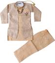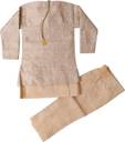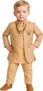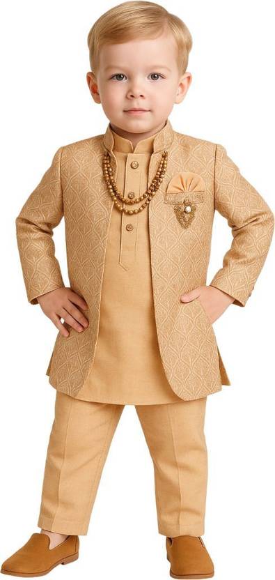 Dress your child in this charming ethnic outfit designed for style and comfort. This traditional kurta-pajama set with a jacket is tailored to perfection with high-quality fabric and a modern design. The peach kurta is paired with a beige pajama and an intricately patterned jacket, making it perfect for festive occasions like Diwali, Eid, and weddings. Its breathable material ensures your little prince stays comfortable while looking adorable.