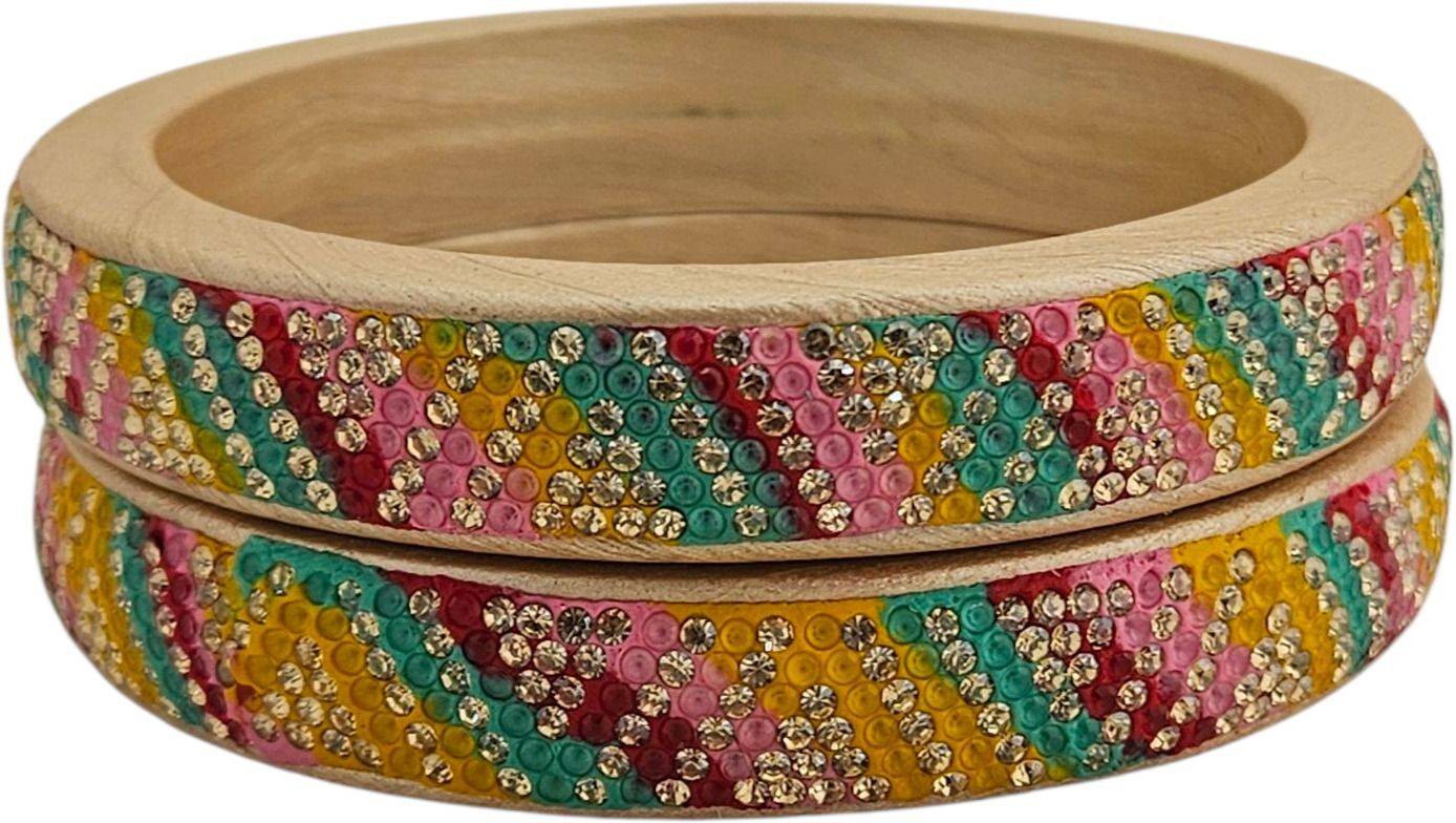 These bangles are made from premium quality lac, offering durability along with an elegant handcrafted finish. The rich blend of yellow, pink, green, and maroon colours ensures they match effortlessly with a variety of ethnic outfits.
