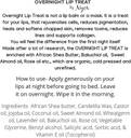 Overnight Lip Treat is not just a lip balm or a mask. It is a treat for your lips, that rejuvenates cells, reduces pigmentation, heals and softens chapped skin, removes toxins, reduces lines and supports collagen. You will feel the difference from the first night itself Made after a lot of research, this soft and creamy textured OVERNIGHT LIP TREAT is enriched with African Shea Butter, Bakuchiol oil, Sweet Almond oil, Rose oil etc., which are organic, cold pressed and unrefined