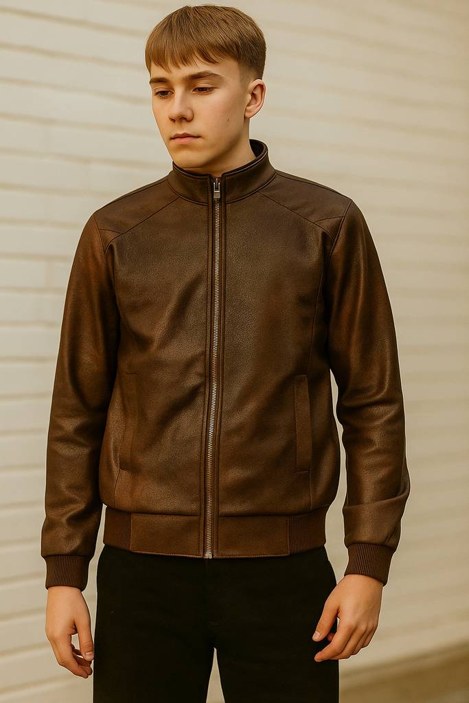 Stylish faux leather jacket featuring a sleek stand collar, front zip closure, and quilted shoulder detailing. Designed with zippered pockets, a slim-fit silhouette, and soft inner lining for all-day comfort and urban edge.