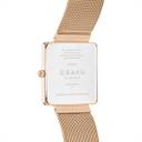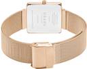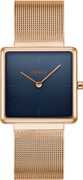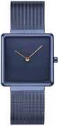 Obaku Kvadrat V236LXVLMV is a women's quartz watch that is a stylish combination of gold and navy blue. The square case and mesh bracelet made of stainless steel are combined with an analog dial covered with hard sapphire glass. The model is resistant to small amounts of water thanks to its water resistance of 3 ATM. The manufacturer's warranty is 3 years.