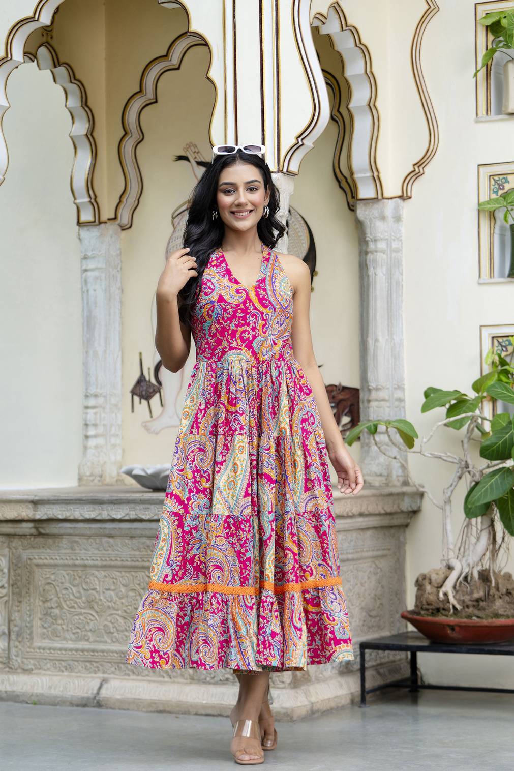 The outfit showcases a beautiful paisley pattern, giving it an elegant and timeless appeal. This overall pattern enhances the aesthetics of the gown, making it suitable for various occasions. This dress can be an ideal choice whether it is a lunch outing or a festive celebration. You can accessorise it with statement jewellery to accentuate your fashion game.