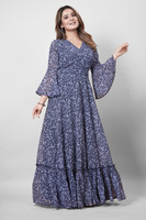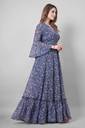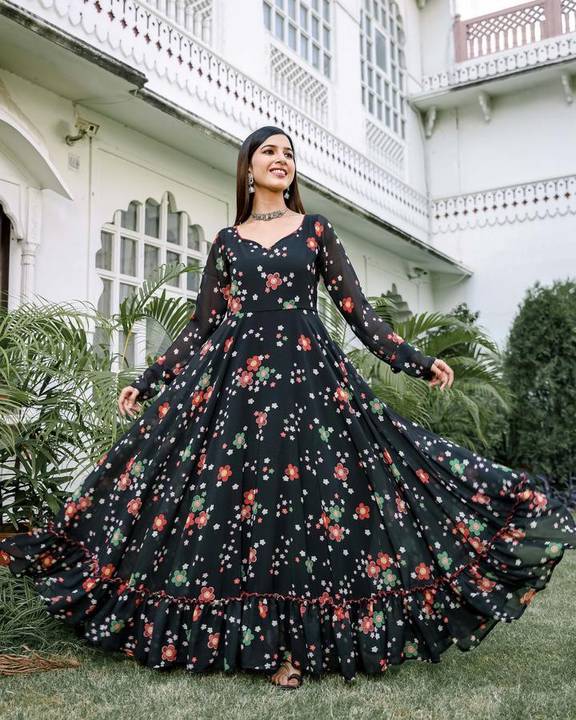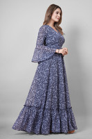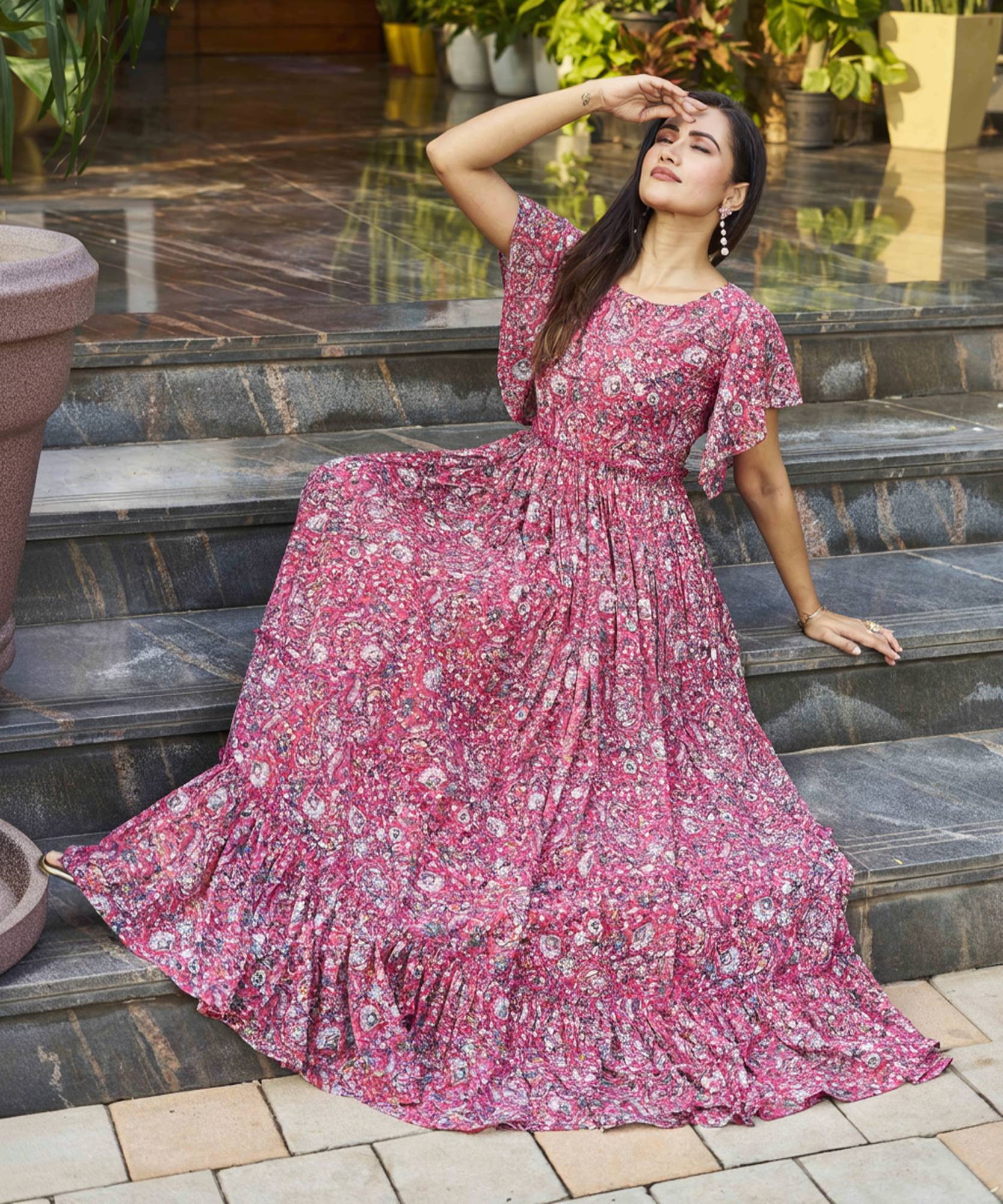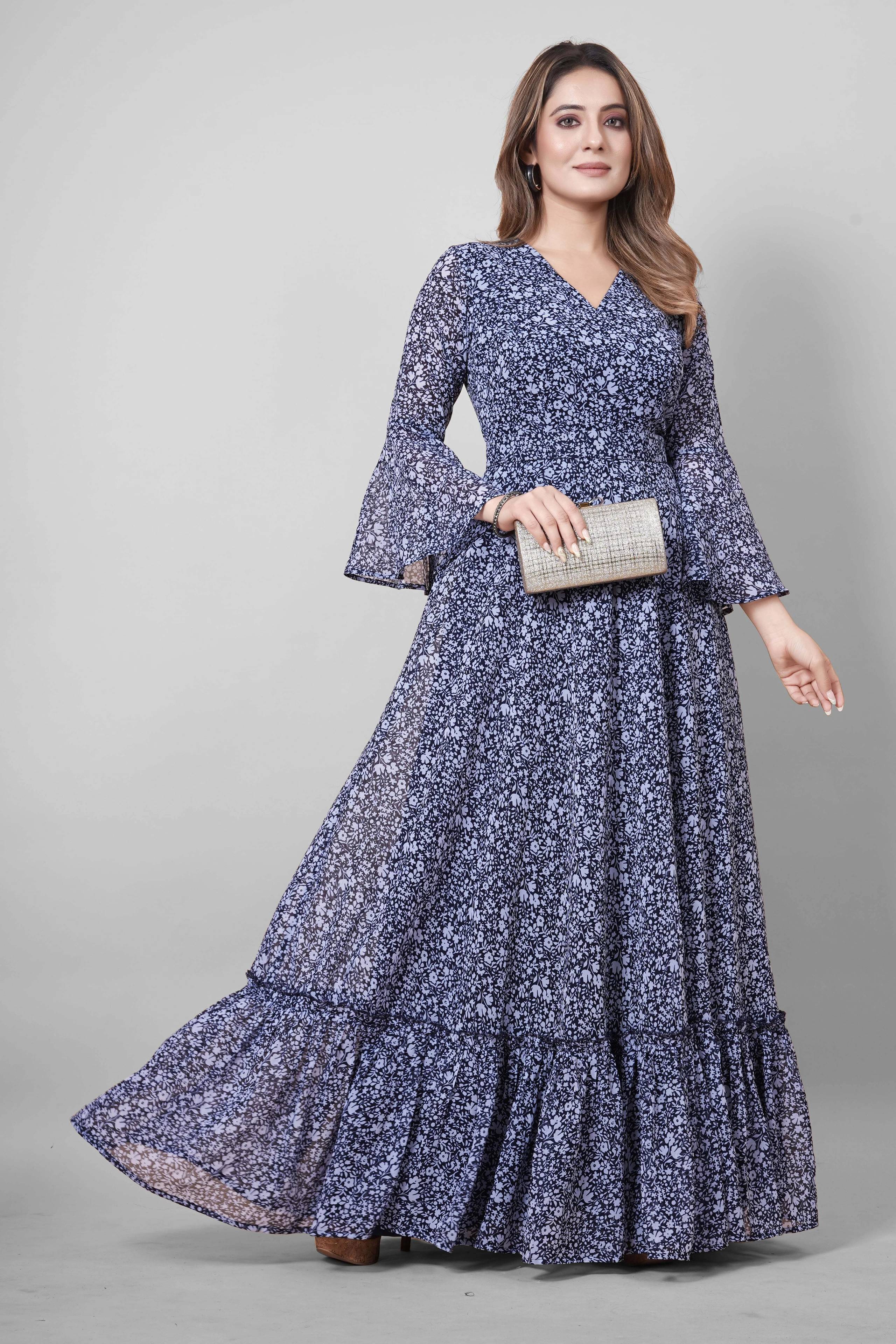 Exude effortless charm with this delicately designed floral gown crafted from soft, flowy georgette fabric. The delicate floral patterns are artfully arranged to enhance their graceful appeal and add a touch of elegance. Ideal for any occasion, from daytime festivities to elegant evening gatherings, this gown ensures you look refined with minimal effort.