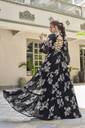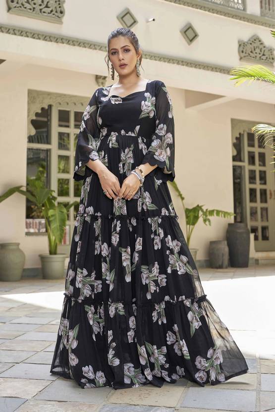 Floral Print Georgette Stitched Flared/A-line Gown (Black)