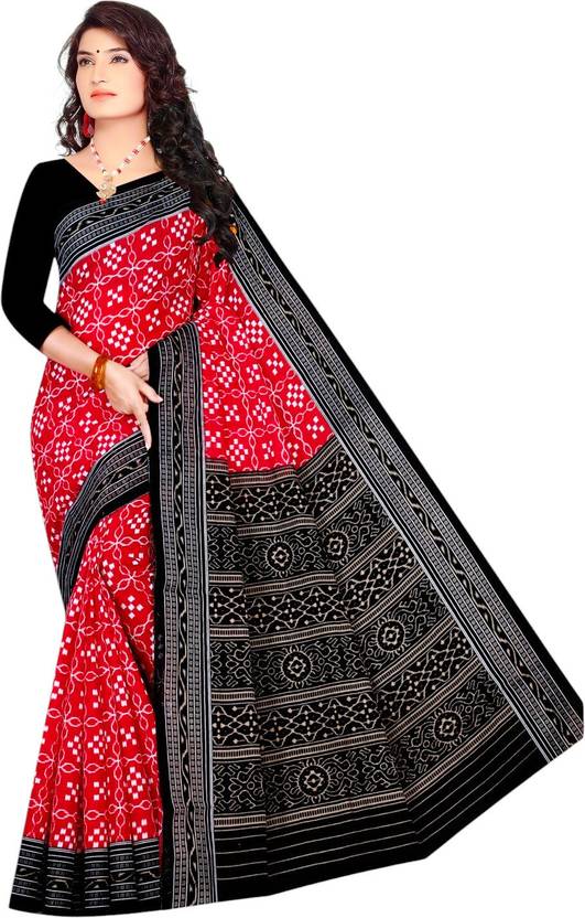Odissi Fashion Printed Ikkat Pure Cotton Saree (Red, Black)