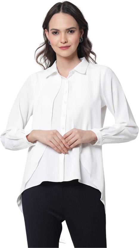 Another workwear addition for your wardrobe, this top features a spread collar, full sleeves, overlap detail and an asymmetric hemline.