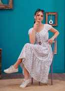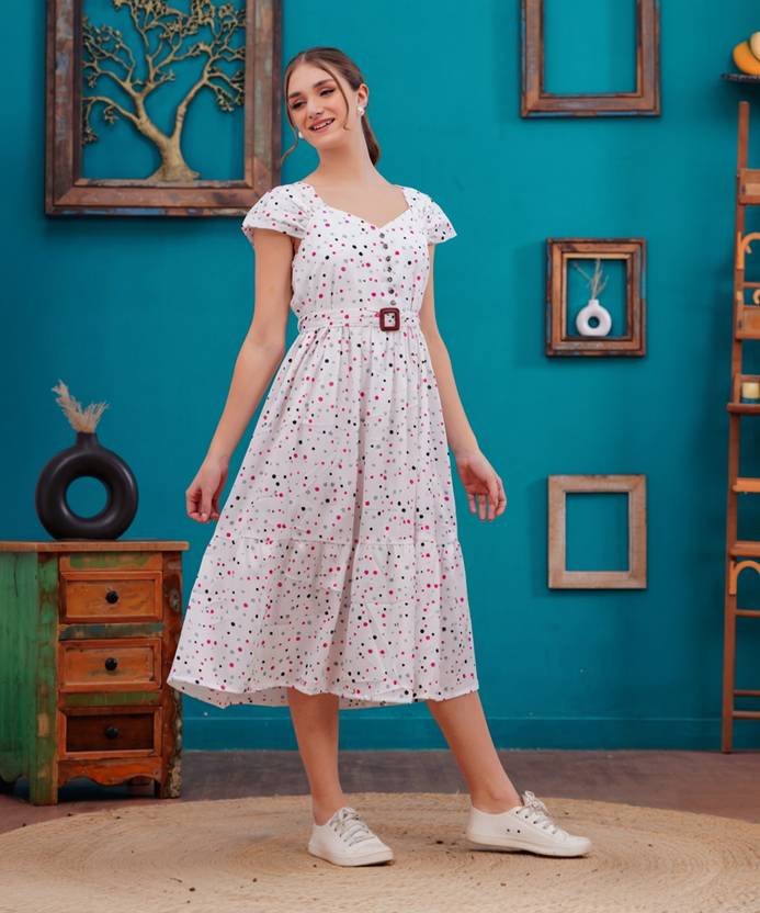 Elevate your style with this lightweight crepe dress, featuring a playful polka-dot print in Pink, black, and white. Designed with cap sleeves and a belted waist, it's perfect for casual outings or daytime events. Pair it with sneakers for a chic look.