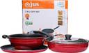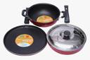 In this set, you will find a flat tawa for making chappatis and dosas, a frying pan for light frying and a kadhai with a glass lid for making curries and other large dishes.