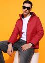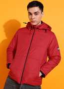 Red Solid Lightweight Puffer Jacket, Has A Hooded, 2 Pockets ,Has A Zip Closure, Long Sleeves, Straight Hemline, Polyester Lining