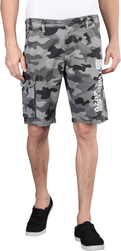 Men Cargo Grey Camouflage shorts, with mid raise waiste, has button and zipper closer