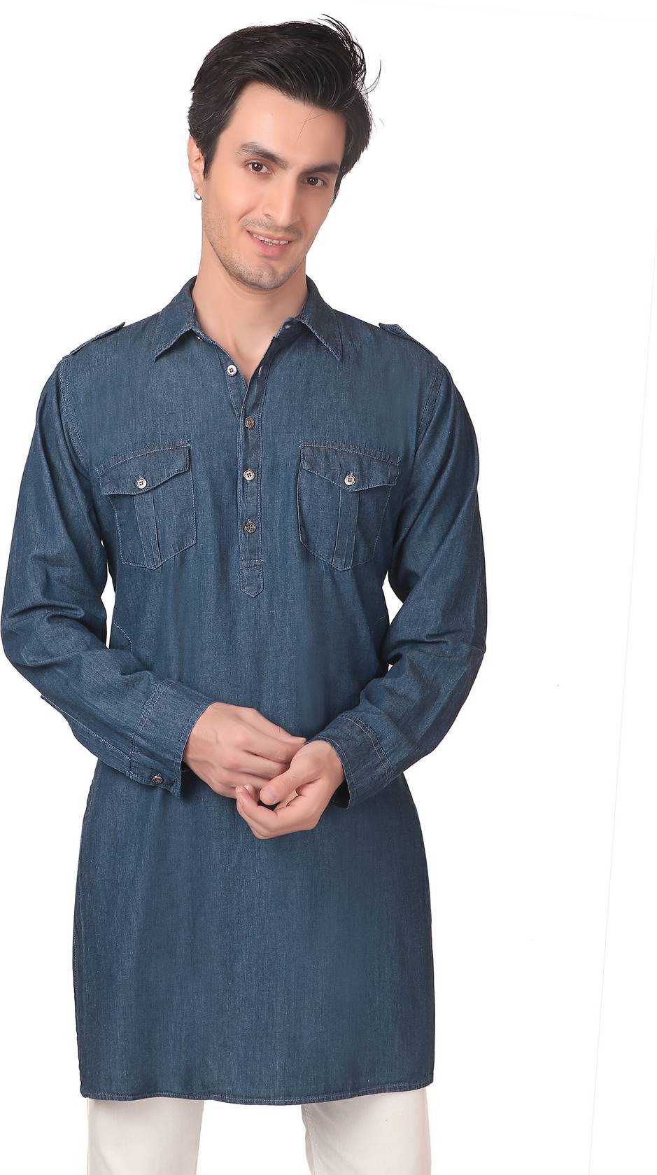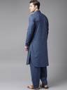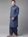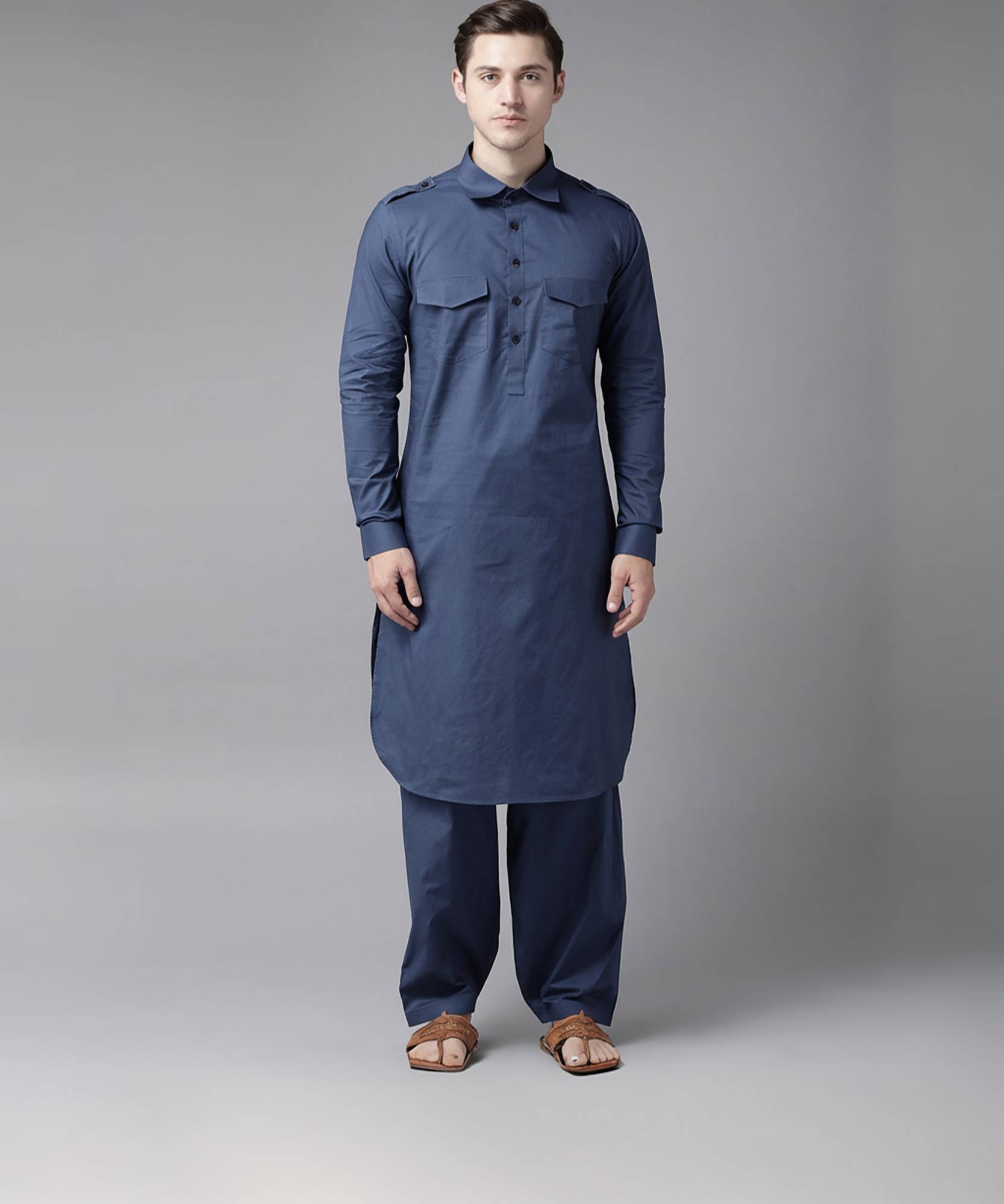 Navy Blue solid Pathani kurta with salwar, Black solid Pathani knee length kurta, has a shirt collar, long sleeves, curved hem, concealed button placket, one chest pocket, two mock pockets on the side, Navy blue solid salwar, drawstring closure