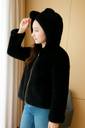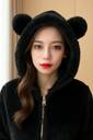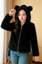 This cozy jacket features a soft, plush material with a relaxed fit, making it perfect for chilly weather. The hood is designed with playful ears, adding a whimsical touch to the overall style. The front zipper closure ensures a snug fit, while the long sleeves provide additional warmth. Paired with a simple skirt, this jacket offers both comfort and a cute, casual look that’s easy to wear for a variety of occasions.