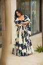 A woman wearing a maxi dress, cream/off-white with a printed red hibiscus floral pattern. The dress features puffy, 3/4-length sleeves, a square neck, a tiered, ruffled skirt, and flowing fabric; the is bright, outdoor, natural, and shows a woman in a stylish, and trendy summer outfit; realism, high detail, studio lighting.