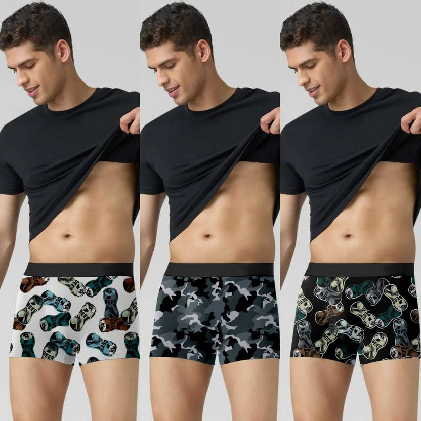 Men's boxer briefs, available in packs of three, feature unique designs print. They are made from Lycra cotton fabric and designed for ultra-comfort.