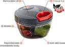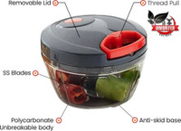 This chopper boasts a thoughtful design, featuring a removable lid, a thread pull mechanism for effortless operation, stainless steel blades ensuring precision cutting, an anti-skid base for stability, and an unbreakable body for durability and safety.
