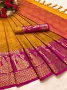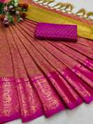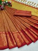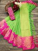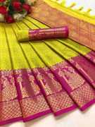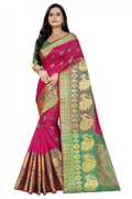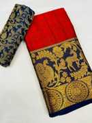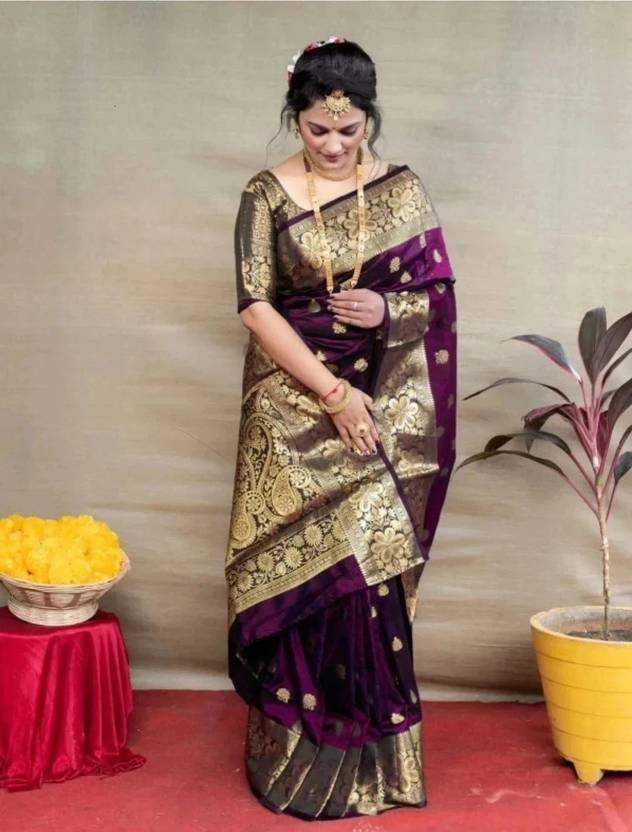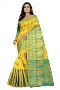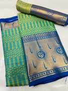 Made from high-quality banarasi silk fabric., Soft, lightweight, and drapes beautifully., Intricate floral design woven in vibrant colors., Comes with an assemblage blouse piece made from the same fabric., Free size., Dry clean only.