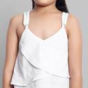 This elegant white camisole is crafted from a soft, lightweight fabric, perfect for layering or wearing on its own. It features delicate straps, a flattering scoop neckline, and a relaxed fit that gently drapes over the body. The standout feature is the flared hem, which adds a touch of playful sophistication to the design. The flared edges create a flowing, feminine silhouette that sways with movement, making it ideal for casual outings or even a more polished evening look when paired with accessories. The clean, crisp white color offers a versatile base for a variety of looks, making it a wardrobe staple.