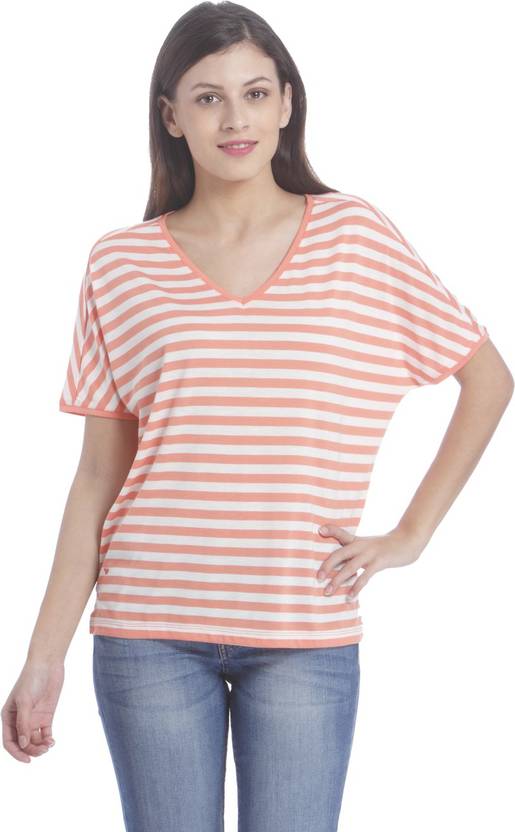 ONLY Casual Short Sleeve Striped Women White, Orange Top
