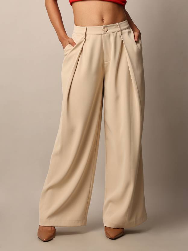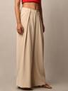 Tailored trousers in woven fabric. High waist with a zip fly and a concealed button and hook-and-eye fastener. Diagonal side pockets, wide, flared legs with pleats at the top and creases down the front and back
