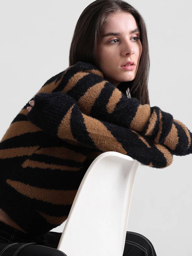 ONLY Self Design Round Neck Casual Women Black Sweater
