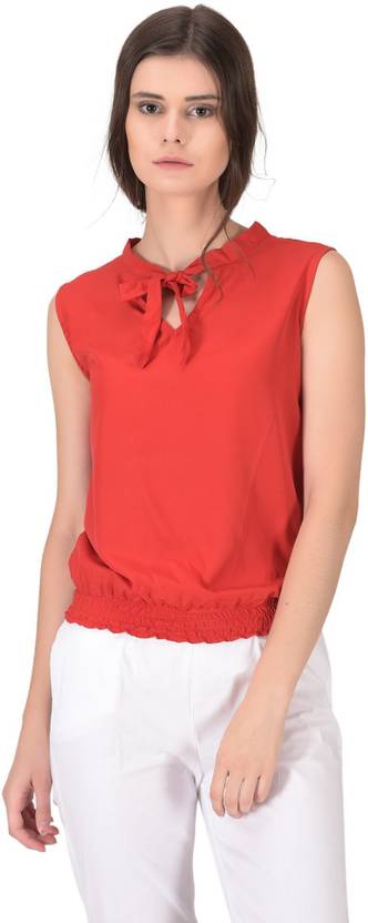 Top Style: Gathered sleeveless top wth pussy bow collar. Fabric Style: Solid fabric. Styling Tip: Can be be styled both as a breezy casual outfit and a playful party outfit.. Garment Fit: Garment is made with relaxed fit. . Fabric Type: Garment is made of crepe, which drapes well on all body types. Wash Care: First Wash Dry Clean, thereafter Hand wash