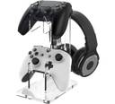 About this item ?Excellent Materials?: Made of high-quality acrylic, it is durable for use, crystal clear, and its clear design can greatly display all your controllers. And the non-slip mat design can keep the controller stable in the stand. ?Good Compatibility?: Our controller holder can perfect hold universal gamepad, such as ps4, ps5, ps4 xbox, One Xbox, Series X, Xbox 360 Switch Steam, STEAM, Switch, etc. Besides, the headphone stand can contain a full-size gaming headset. ?High Stability?:Comes with a sturdy base and the bottom of the base equiped with rubber feet, this controller stand can prevent the stand fall down accidentally and protect your desktop well. ?Well-organized?:This controller stand allows you to hold up 2 controllers and a full-size gaming headset, saving space. You can put your controller orderly and your room organized. ?Great Gift?: This controller stand is a great gift for family, friends who love to play games, kids, boyfriends, on holidays, birthday, anniversaries and other festivals. THIS STAND IS ASSEMBLE REQUIRED, ''STAND ONLY PROVIDE DEVICE NOT INCLUDE''