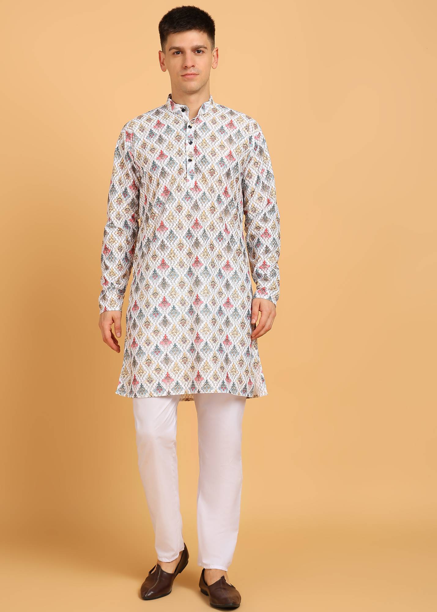 Perfect as a party wear option or for traditional gatherings, this kurta pyjama set is a must-have in any wardrobe. Pair it with mojari shoes for a complete ethnic look that exudes grace and refinement. Available in multiple sizes, this set ensures a perfect fit for every man. Embrace the essence of Indian ethnic wear with this stylish and comfortable ensemble.
