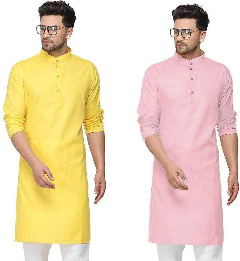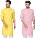 OORA Pack of 2 Men Solid Cotton Blend Straight Kurta (Yellow, Pink)