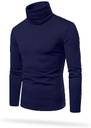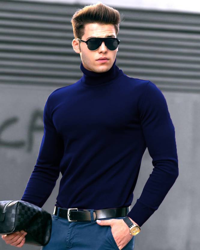 OOSH Navy Blue Solid High Neck Full Sleeve Casual T-Shirt