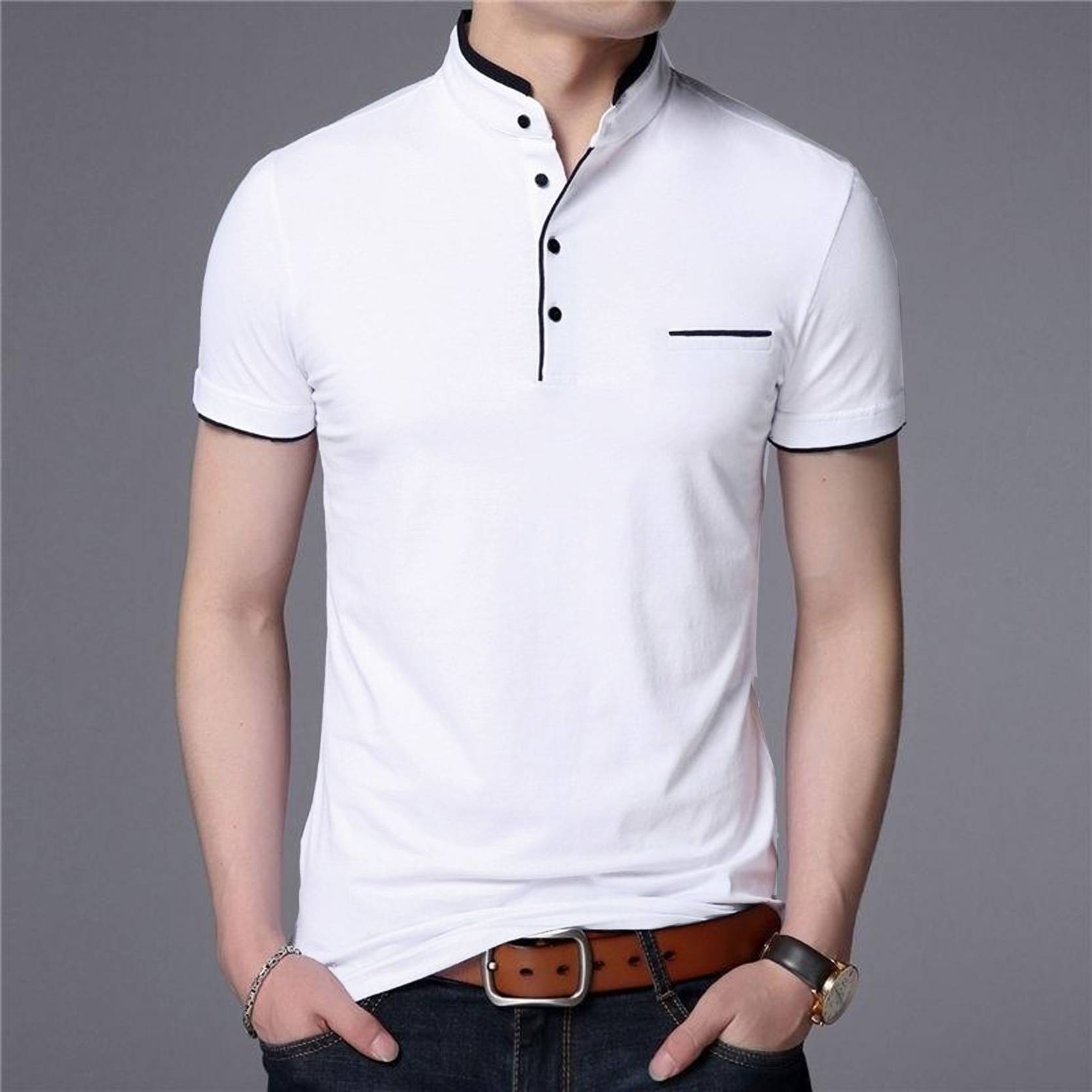 Oosh Solid Men Mandarin Collar White T-Shirt